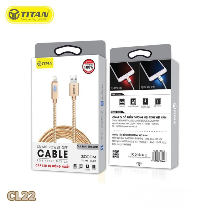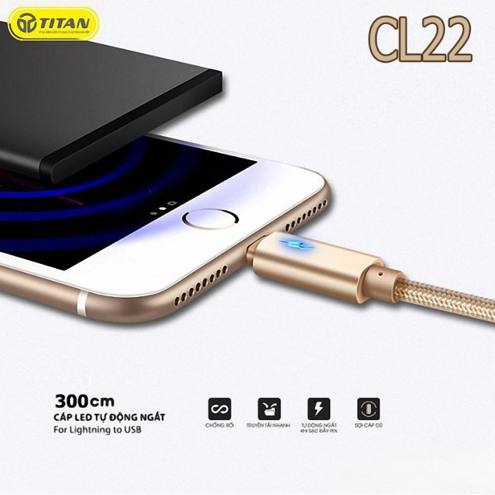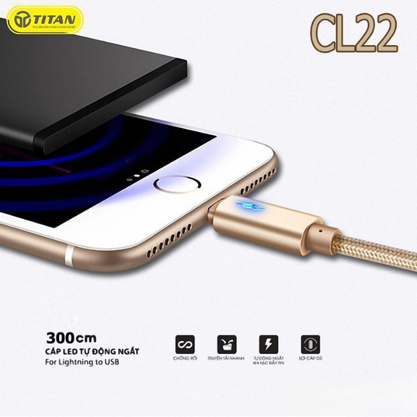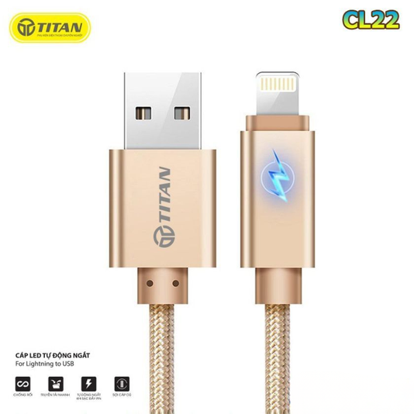 Titan CL22 là dòng dây cáp sạc và truyền dữ liệu nhanh cao cấp chính hãng dành cho các dòng điện thoại iPhone (từ iPhone 5 trở lên) và các dòng máy tính bảng, có chiều dài 3m. Với thết kế chắc chắn dây bọc dù bên ngoài, khả năng chống xoắn rối tốt, đặc biệt được tích hợp đèn LED báo tín hiệu ở đầu dây cáp sạc tự động ngắt khi pin thiết bị đầy, một điểm nổi bật mà không phải loại cáp sạc nào cũng có.