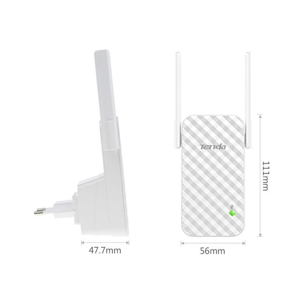 Thiết bị mở rộng sóng WiFi chuẩn N tốc độ 300Mbps Tenda A9 sở hữu thiết kế gọn gàng chỉ 111 x 56 x 47.7mm. Do đó dù đặt nó ở đâu cũng không lo tốn quá nhiều không gian của ổ cắm điện.